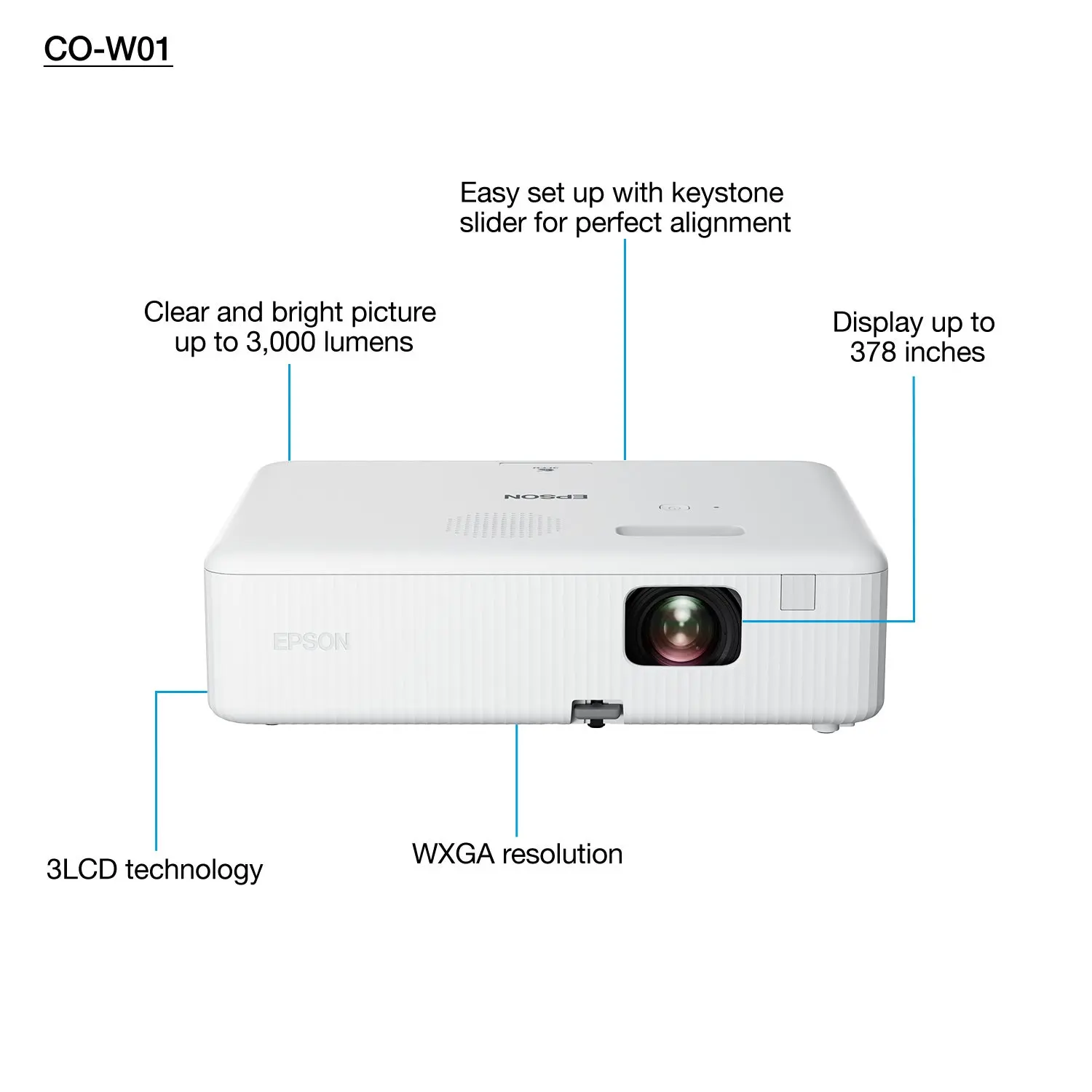 Epson CO-W01 Projector 3LCD Technology, WXGA, 1280 x 800, 16:10, 3000 Lumen – 2000 Lumen (economy), 16,000: 1, HDMI 1.4, USB 2.0-A, USB 2.0 Type B (Service Only), 2.4 kg, 5W, White, Main unit, Power cable, Quick Start Guide, Remote control incl. batteries, User manual (CD), Warranty card 24 months Carry in – V11HA86040